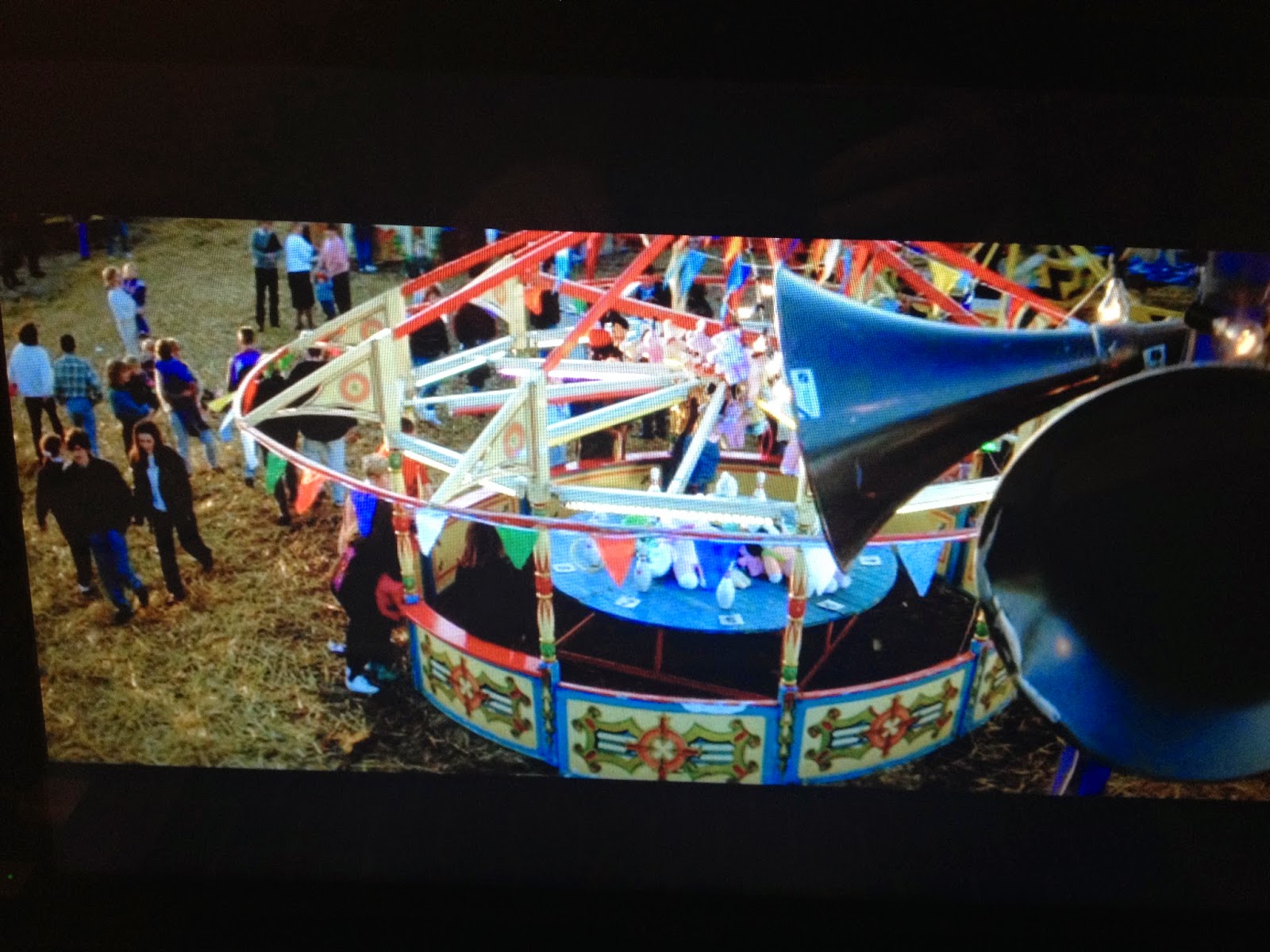 This first shot is an establishing shot that then starts to slowly pan across to reveal the setting. The fairground could signify that this is a family friendly movie and also that it will contain a young central character. The slight shadow of the bridge around the edge of the frame also makes it look like a point of view shot.